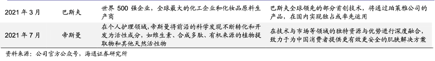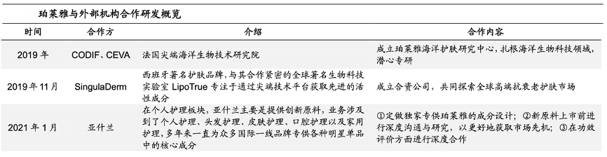 經典案例:根據公司官方公眾號、海通證券研究所等綜合資訊表明,2021年公司與亞什蘭達成戰略合作,亞什蘭定做獨家專供珀萊雅的成分設計、在新原料上市和功效評價方面進行深度合作。同年3月與巴斯夫達成戰略合作,巴斯夫全球領先的部分首創技術,將通過珀萊雅公司的產品,在國內實現獨占或率先運用;同年 7 月與帝斯曼在技術與市場等領域的獨特資源與優勢進行深度融合。