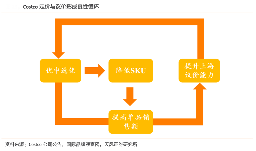 經(jīng)典案例:根據(jù)Costco公司公告、國際品牌觀察網(wǎng)、天風證券研究所等綜合資訊表明,Costco低SKU+高質量產品,定價與議價產生良性循環(huán)。Costco除提供普通 大賣場銷售商品外,還出售各種電子產品、大型家電等長尾品類,但其線下門店的 SKU 數(shù)仍控制在僅 4000 左右,關鍵就是緊扣會員偏好選品,大包裝模式與批發(fā)購買帶來的低單價能夠有效刺激會員的購物欲望,從而形成了定價與議價的良性循環(huán)。