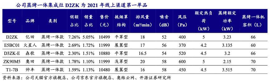 經(jīng)典案例:根據(jù)公司天貓官方旗艦店、公司京東官方旗艦店、奧維云網(wǎng)、開(kāi)源證券研究所等綜合資訊表明,億田智能D2ZK 煙灶蒸烤一體集成灶產(chǎn)品憑借其大風(fēng)量、低噪音、高熱負(fù)荷、大容積的全面型高產(chǎn)品力,以及高性?xún)r(jià)比的價(jià)格,2021年雙 11 大促中單品銷(xiāo)售突破 1 億,成為集成灶品類(lèi)全網(wǎng)第一單品,根據(jù)億田實(shí)驗(yàn)室數(shù)據(jù),D2ZK的吸凈率達(dá)到99.95%。
