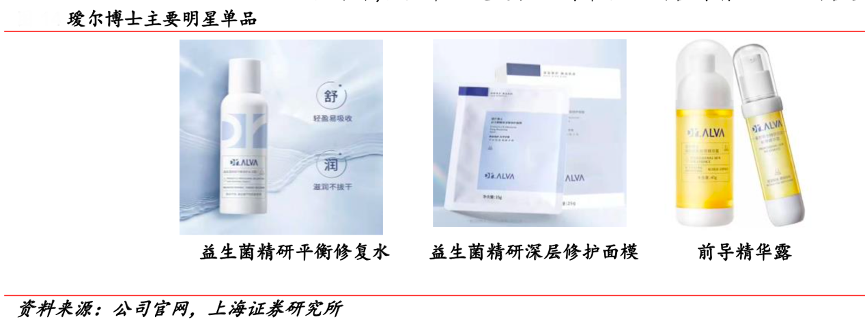 經(jīng)典案例:根據(jù)公司官網(wǎng)、上海證券研究所等綜合資訊表明,璦爾博士定位微生態(tài)護(hù)膚,旗下主要品類為面膜、水乳、潔面乳、營(yíng)養(yǎng)液、保濕霜、精華液、 修護(hù)水等。產(chǎn)品含有二裂酵母、奧婷敏等多種微生態(tài)成分,有效的修復(fù)肌膚屏障。