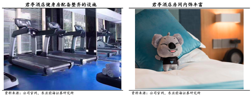 經典案例:根據公司官網、東亞前海證券研究所等綜合資訊表明,君亭酒店在酒店行業創新性地提出了“BAS”精選服務模式,“BAS”即Bed(住宿)、Art(文化藝術)和Service(服務),意思是在提供高品質客房這一核心住宿服務前提下,在客房、公共空間均融入了鮮明的文化藝術主題元素,并為客人提供專屬設計的貼心衍生服務。例如君亭酒店主要選取“金可兒”床墊、“科勒”衛浴和 “康乃馨”棉織品等超過現酒店檔次的配套設施,因此在入住舒適度和消 費體驗方面超過同定位的其他品牌。另外,部分酒店還提供豪華健身房、泳池、會議室等場地。
