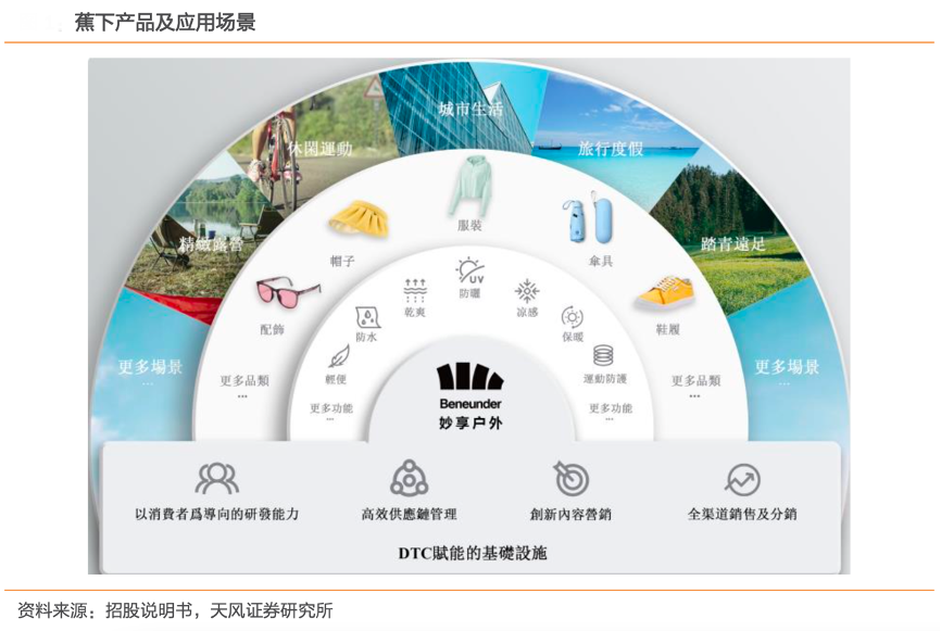 經典案例:根據招股說明書、天風證券研究所等綜合資訊表明,蕉下成立于 2013 年,專為具備休 閑社交屬性的非競技運動及戶外活動場景而設計,包括城市生活、休閑運動、旅行度假、踏青遠足、露營等。其專主要覆蓋服裝、傘具、帽子、其他配飾、鞋履,為消費者提供全面產品。根據灼識咨詢,以2021年總零售 額及線上零售額計,蕉下均為中國第一大防曬服飾品牌,分別擁有 5.0%及12.9%的市場份額。