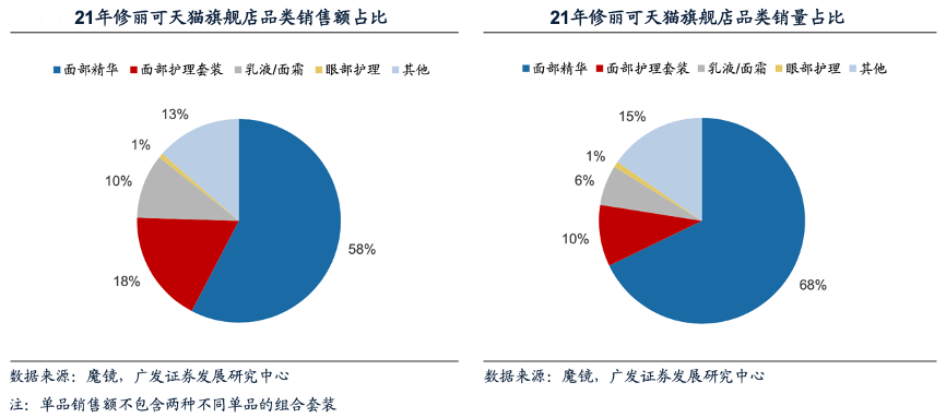 經(jīng)典案例:根據(jù)魔鏡、廣發(fā)證券發(fā)展研究中心等綜合資訊表明,2021年修麗可天貓旗艦店接近六成銷售額及七成銷量來(lái)源于面部精華品類,面部護(hù)理套裝和乳液/面霜品類分別貢獻(xiàn)約兩成及一成銷售額;2020-21年修麗可面部精華品類銷售額在天貓面部精華類目占比由2.8%增至5.0%,乳液面霜品類銷售額在天貓乳液面霜類目占比由0.5%增至1.1%。
