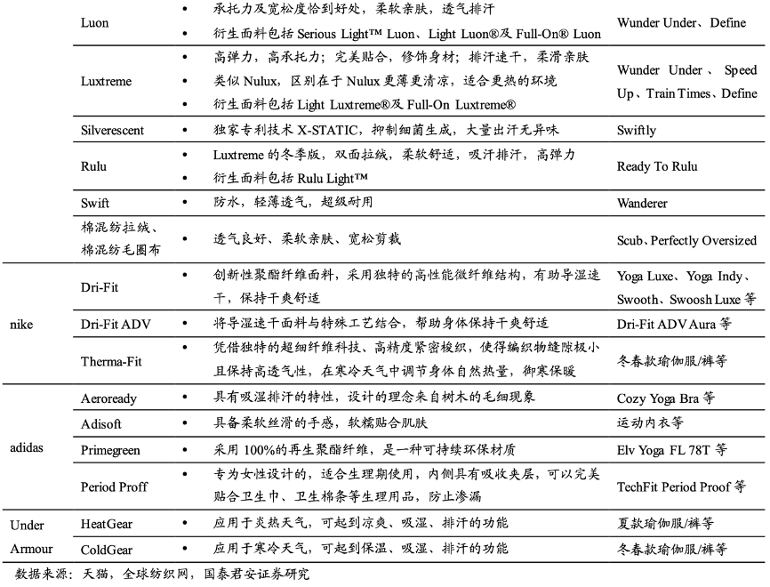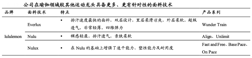 經(jīng)典案例:根據(jù)天貓、全球紡織網(wǎng)、國(guó)泰君安證券研究等綜合資訊表明,Lululemon公司目前針對(duì)瑜伽、跑步及綜 訓(xùn)等不同場(chǎng)景,開(kāi)發(fā)出多款明星產(chǎn)品,包括 Align、Fast and Free、Wunder Train 等,當(dāng)中應(yīng)用了公司與面料供應(yīng)商合作開(kāi)發(fā)的專(zhuān)用面料,如主打速干的 Everlux、主打防水的 Swift 等。公司通過(guò)協(xié)議、專(zhuān)利及商業(yè)機(jī)密保 護(hù)等措施,實(shí)現(xiàn)了面料的獨(dú)家性。與nike、adidas及Under Armour相比,公司在瑜伽領(lǐng)域深耕多年,擁有更加豐富且有針對(duì)性的面料科技。