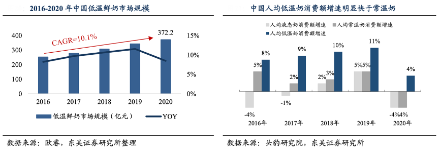 經典案例:根據歐睿、頭豹研究院、東吳證券研究所等綜合資訊表明,低溫鮮奶采用巴氏殺菌技術實現殺滅有害菌群并保存活性營養物質,消費者對健康的更高追求及冷鏈的快速發展助力低溫鮮奶的發展。2016-2020年,中國低溫奶業務以 10.1%的年復合增長率迅速增長,至 2020 年市場規模已超 370 億元。中國低溫奶消費正處于量價齊升階段,人均低溫奶消費量和單價均持續 增長,且增速明顯快于常溫奶和液態奶整體。