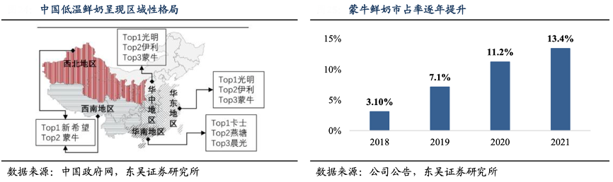 經典案例:根據中國政府網、公司公告、東吳證券研究所等綜合資訊表明,受低溫奶保質期短的影響,低溫鮮奶市場以奶源為中心,冷鏈運輸為半徑,地方性乳企擁有先天優勢,競爭格局區域特征鮮明。而近年來,蒙牛、伊利等全國性乳企利用渠道、品牌優勢及全國化奶源布局爭相布局低溫鮮奶市場。2018-2021年,蒙牛在鮮奶市場的市占率持續提升,2021年已達13.4%,躍升至行業第二,第一位為深耕華東市場的光明乳業。