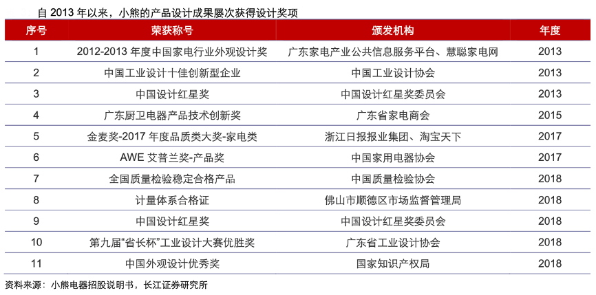經典案例:根據小熊電器招股說明書、長江證券研究所等綜合資訊表明,小熊針對年輕消費群體,且在產品功能適配需求、外觀及產品形象層面做了較大投入,形成了自己的標簽——創意個性化小家電,即溫馨可愛的獨 特產品風格。自 2013 年以來,小熊的產品設計屢次獲得設計獎項,贏得市場的高度認可。截止招股說明書簽署日,其擁有專利 486 項,其中發明專利 11 項、實用新型 194 項以及外 觀設計 281 項,外觀專利占比高達 58%。