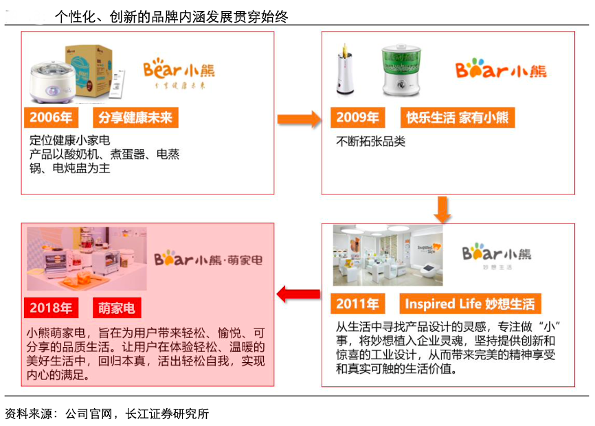 經(jīng)典案例:根據(jù)公司官網(wǎng)、長江證券研究所等綜合資訊表明,早在 2006 年,小熊電器公司在廣州佛山成立的初始階段,其已開發(fā)了酸奶機(jī)、煮蛋器、電蒸鍋、電燉盅等當(dāng)前仍在熱銷的小家電細(xì)分品類;此后,其品牌內(nèi)涵不斷迭代和演化,“健康未來”—“快樂生活”—“妙想生活”—“萌家電”,無一不是從區(qū)別于美九蘇的差異化定位出發(fā)。
