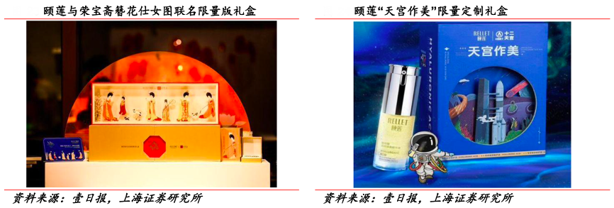 經典案例:根據壹日報、上海證券研究所等綜合資訊表明,頤蓮通過 IP 聯名、KOL種草、直播、短視頻等方式,深挖線上引流資源,進行品牌文化傳播,其先后與中國航天、榮寶 齋簪花仕女圖 IP 聯名,推出新國潮護膚品。