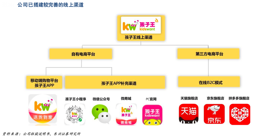 經典案例:根據公司招股說明書、東興證券研究所等綜合資訊表明,面對近年來零售渠道的線上化轉型,孩子王已搭建較為完善的線上銷 售體系。其主要通過移動端購物平臺(孩子王 APP)、微信平臺(孩子王公眾號、小程序、微商城)、 PC 端購物平臺(孩子王網上商城)等網絡平臺開展線上業務,還通過第三方電商平臺“天貓商城”、“京東”、“拼多多”開設“孩子王官方旗艦店”。 2019 年公司的孩子王 APP 在 Trustdata 母嬰電商類 APP 的排名第一。