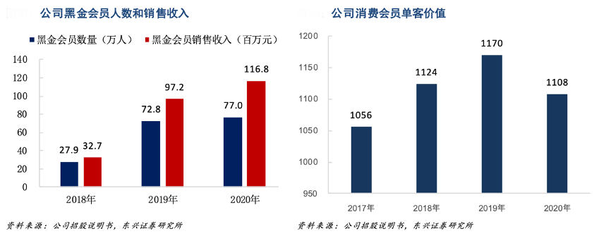 經典案例:根據公司招股說明書、東興證券研究所等綜合資訊表明,為進一步提高單客產值,黑子王公司對會員進行了更加精細化的運營。其公司 2018 年 5 月推出付費黑金 PLUS 會員,分別針對孕婦和嬰幼童兩大目標用戶推出了孕享卡(399 元/年) 和成長卡(199 元/年),有效期均為 1 年,截至 2020 年末公司累計黑金會員 規模超過 70 萬人,會員數量和銷售收入逐年增加,2018 年-2020 年黑金會員單個會員平均收入分別為 117.36 元/133.53 元/151.71 元,2020 年付費會員單客年產值為普通會員的 10 倍。
