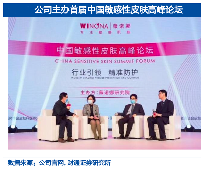 經典案例:根據公司官網、財通證券研究所等綜合資訊表明,自 2013 年起,薇諾娜公司攜手中國醫師協會,每年舉辦“5.25全民護膚日”大型公益活動,期間聯合行業協會、近 300 家知名合作醫院共同開展全國性公益義診活動。此外,其公司持續深化其皮膚科權威度,2020年發起首屆中國敏感性皮膚高峰論壇,會上發布權威敏感肌防護指南獲得業界廣泛認可,成為繼 2019 年第 24 屆世界皮膚科大會后在敏感肌學術領域的新里程碑。