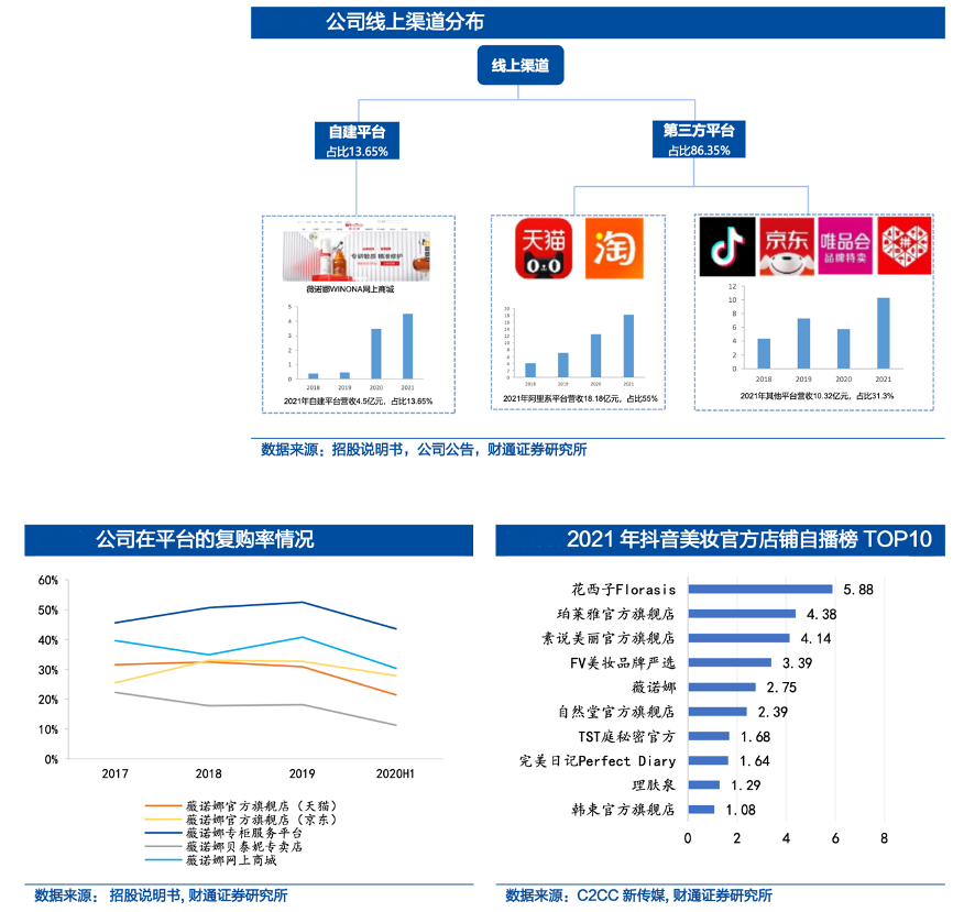 經典案例:根據招股說明書、公司公告、C2CC新傳媒、財通證券研究所等綜合資訊表明,薇諾娜公司線上分為自營渠道和分銷渠道,主要通過第三方平臺和自建平臺進行銷售。其在阿里系2021年實現營收 18.18 億元,占線上渠道比重55%。同時其還創建了公眾號“薇諾娜專柜服務平臺”等私域平臺,通過私域流量運營進一步增強客戶粘性、提高復購率。2017- 2020H1,薇諾娜專柜服務平臺的客戶復購率保持在 50%左右的較高水平,顯著高于天貓、京東等公域流量平臺。