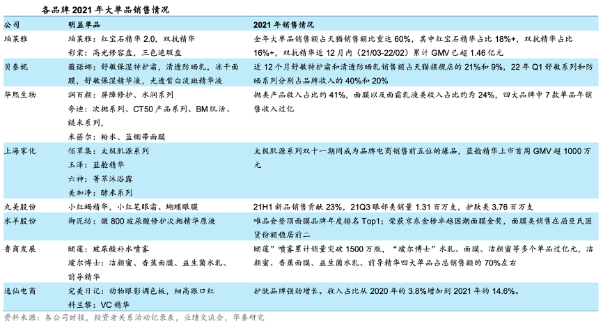 經典案例:根據各公司財報、投資者關系活動記錄表、業績交流會、華泰研究等綜合資訊表明,2021 年,珀萊雅、貝泰妮(薇諾娜)、華熙生物(潤百顏/夸迪等)等國貨龍頭繼續發力產品,明星單品的亮眼表現成為其收入增長根本引擎。