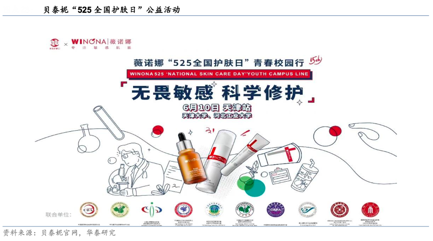 經典案例:根據貝泰妮官網、華泰研究等綜合資訊表明,貝泰妮積累強品牌認知度,雙11等促銷季更多自然流量轉化。品牌雙 11 和雙 12 購物節的虹吸效應明顯,21 年 Q4 收入達 19.1 億元,全年占比 47.49%。同時其也抓住38 節、618 購物節等時機進行促銷活動。2021年創造性開展“525 全國護膚日”公益行動,在全國 11 大城市開產20 長聯合超頭部線下渠道義診活動,引導消費者合理預期化妝品功效,提高品牌知名度。