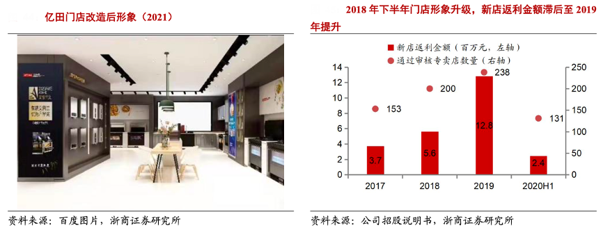 經典案例:根據百度圖片、公司招股說明書、浙商證券研究所等綜合資訊表明,億田公司提升省會城市的返利門檻,從 2017、2018 年的 150 萬調整為 2019-2020H1 的 200 萬,提高經銷商的銷售積極性;同時推進經銷商門店升級改造并給予返利支持,截至 2021H1其已完成 800 多家終端門店形象改造升級。