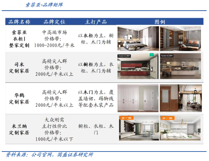 經典案例:根據公司官網、國盛證券研究所等綜合資訊表明,索菲亞成立于2003年廣州增城,中國衣柜行業的先行者,2011 年 A 股上市,成為國內定制家居第一股,2013年開啟大家居戰略,2021年將索菲亞主品牌“柜類定制專 家”升級為“衣柜|整家定制”。目前,索菲亞戰略定位“整家定制”,多品類、多品牌、全渠道融合發展。2015-2021 年收入從 31.96 億元提升至 104.07 億元,CAGR 為 21.7%。