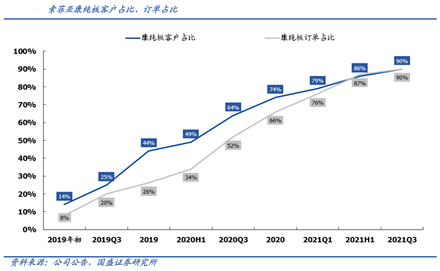 經典案例:根據公司公告、國盛證券研究所等綜合資訊表明,索菲亞公司板材由 E0 板升級至零甲醛添加的康純板,2021年9月索菲亞康純地板正式納入國家孕嬰網體系,成為定制家居唯一入選企業。2019年至2021Q3,索菲亞康純板客戶占比從 14% 上升至約 90%,訂單占比從 8%上升至約 90%。