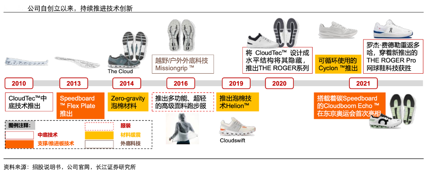 經典案例:根據招股說明書、公司官網、長江證券研究所等綜合資訊表明,On Running(On/昂跑)致力于改善跑步體驗,CloudTec 中底技術+Speedboard+HelionTM Superfoam 泡棉材料構成公司產品核心特色。