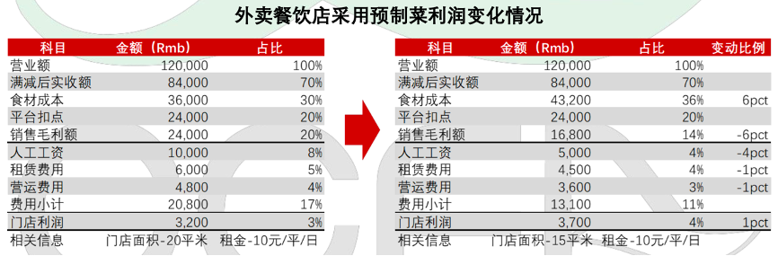經典案例:根據CCFA《餐飲行業:2021年中國連鎖餐飲行業報告》等綜合資訊表明,對于規模更大的連鎖餐飲企業,預制菜可以更顯著地降低成本和提升利潤。結合中國飯店協會的調研,目前國內超過74%的連鎖品牌有自建中央廚房。前瞻研究院的數據顯示,中央廚房具有獨立場所集中完成食品成品或半成品制作并配送,保障菜品新鮮并降低采購配送成本,可以減少約70%從業人員、節約30%配送成本。
