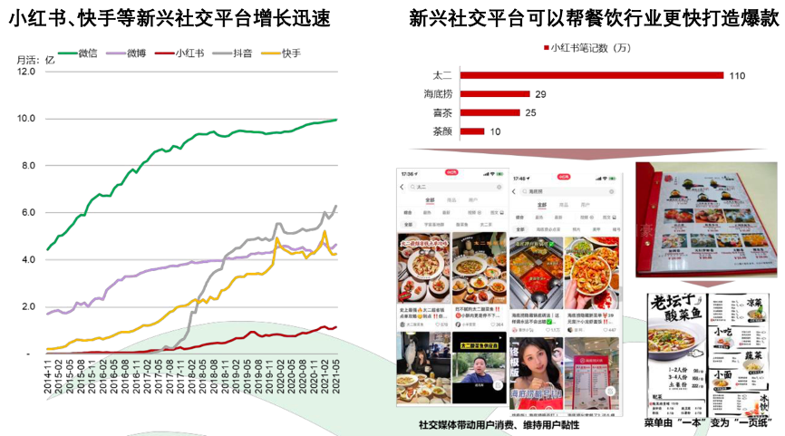 優秀案例:根據CCFA《餐飲行業:2021年中國連鎖餐飲行業報告》等綜合資訊表明,當前比較知名的餐飲企業均在小紅書做了大量的筆記投放,以善于和年輕人溝通的太二為例,其小紅書筆記數已達 110 萬+。此外,餐飲企業會通過社交媒體打造爆款 sku,有了爆款 sku 的加持,能夠大大縮短菜單長度,通過少 sku 的菜單實現 優秀的單店銷售,從而精簡供應鏈的管理,最后實現全鏈條的效率最優。