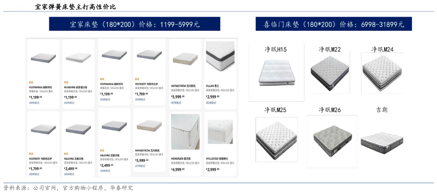 以床墊為例,宜家官方商場共提供 12 款 180cm×200cm 規(guī)格的彈 簧床墊,價(jià)格區(qū)間集中在 1199 元/張-5999 元/張,對標(biāo)國內(nèi)床墊龍頭喜臨門,旗下凈眠系 列彈簧床墊(180cm×200cm)終端售價(jià)在 6998 元/張-31899 元/張,喜臨門凈眠系列主要 定位中高端消費(fèi)群體,而宜家千元級床墊性價(jià)比突出,距離年輕消費(fèi)者更近一步。