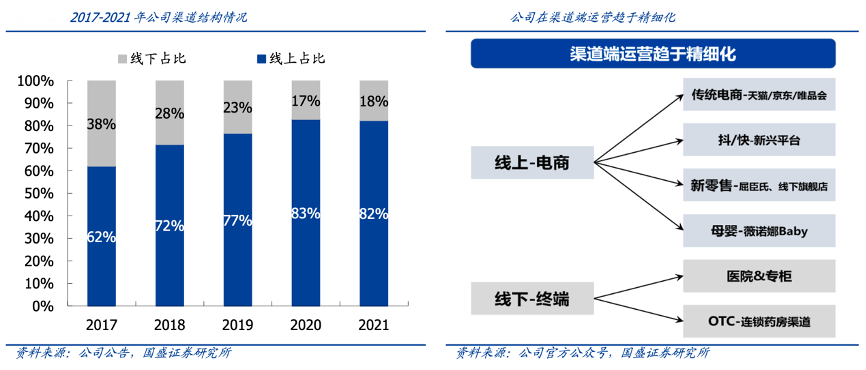 經(jīng)典案例:根據(jù)薇諾娜官方微博、天貓、公司招股書、國盛證券研究所等綜合資訊表明,薇諾娜公司踐行以線下為基礎(chǔ),線上為主導(dǎo)的渠道策略,線下主攻醫(yī)院/OTC 等專業(yè)渠道加深品牌專業(yè)形象,線上渠道充分把握電商及社媒紅利驅(qū)動(dòng)業(yè)績?cè)鲩L。其在組織端對(duì)各業(yè)務(wù)板塊進(jìn)行相應(yīng)的精細(xì)化升級(jí),將電商事業(yè)部細(xì)分為傳統(tǒng)電商、抖快、新零售、薇諾娜Baby,各板塊劃分職責(zé)范圍;終端事業(yè)部則保留專注于醫(yī)院及院外專柜渠道,獨(dú)立出 OTC 事業(yè)部以深耕OTC渠道市場。