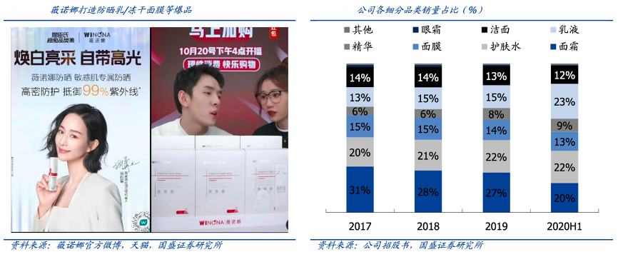 經(jīng)典案例:根據(jù)公司公告、公司官方公眾號(hào)、國盛證券研究所等綜合資訊表明,2021年薇諾娜公司上市40余款新品,爆品打造方面,其不斷嘗試多樣化拉新手段,如通過特定品類代言人推廣防曬乳、借助超頭直播流量打造凍干面膜爆品等。雙十一期間,修護(hù)凍干面膜全網(wǎng)爆賣200W+盒,防曬乳、舒敏修護(hù)精華液銷售金額均破億。