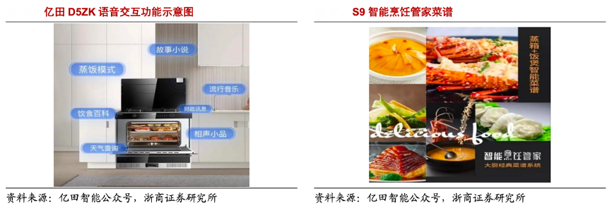 經典案例:根據億田智能公眾號、浙商證券研究所等綜合資訊表明,2019年,億田智能公司開創式研發出蒸烤獨立款集成灶。2020年5月,其和天貓精靈合作發布行業第一臺嚴格意義上具有成熟語音交互功能的云智能產品——“天貓精靈蒸奇妙”D5Z蒸箱款集成灶。2021 年 5 月,億田發布智能烹飪管家 S9,集成了煙機、灶具、蒸箱(與冰箱一體)、保鮮柜、煮飯機器人,其中冰蒸一體為行業首創,并能以 APP 遠程控制,引領產品大增長,刷新新一代產品認知。