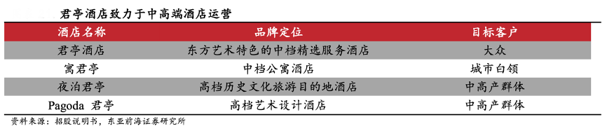 經典案例:根據招股說明書、東亞前海證券研究所等綜合資訊表明,君亭酒店旗下擁有多個中高端品牌,已經建立了成熟的多層次的中 高端酒店品牌,其中“君亭酒店”品牌定位為東方藝術特色的中檔精選服務酒店;“夜泊君亭”品牌定位為高檔歷史文化旅游目的地酒店;“Pagoda 君亭”定位為高檔藝術設計酒店;新收購的君瀾為高端休閑商務模式酒店,景瀾定位為高端度假酒店。根據君亭提供的服務類型和產品定位,君亭酒 店的行業定位為中高檔精選服務酒店。