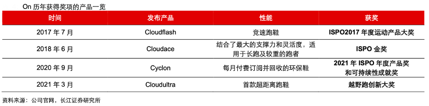 經典案例:根據公司官網、長江證券研究所等綜合資訊表明,2011 年,瑞士聯邦理工學院(ETH)發布研究結果表明,穿著 On 的跑者在測試中的脈搏率和血乳酸水平明顯較低。2014年, On 入選《跑者世界》在美國、英國及德國 20 大最重要跑鞋榜單,2015年 2 月 On Cloud 榮獲 2015/2016ISPO 全球設計大賽最佳運動表現金獎。