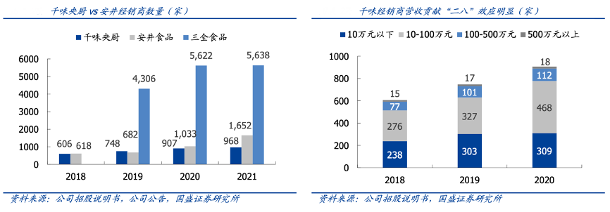 經(jīng)典案例:根據(jù)公司招股說明書、公司公告、國盛證券研究所等綜合資訊表明,2021年底,千味央廚公司經(jīng)銷商數(shù)量增長至 968 家,較 2020 年的 907 家同比+6.73%。此外,從 2020 年起公司開始加大經(jīng)銷渠道建設(shè)力度,賦能核心經(jīng)銷商,例如對百萬元以上經(jīng)銷商配備單獨銷售服務(wù),梳理話術(shù)舉辦品鑒會等,目前已初現(xiàn)成效,占比前20 名經(jīng)銷商銷售額達(dá) 2.06 億,同比+50.1%。