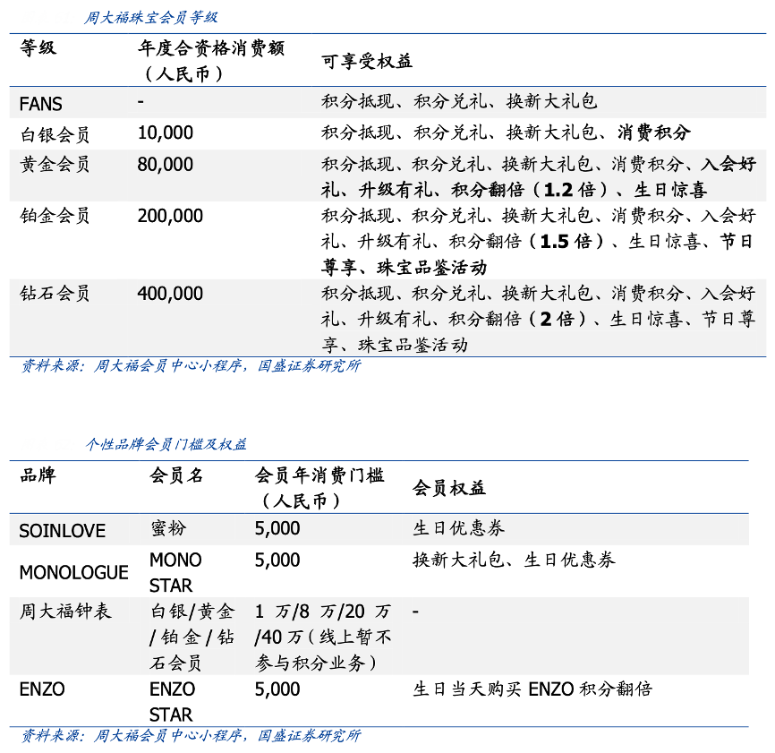 經(jīng)典案例:根據(jù)周大福會員中心小程序、國盛證券研究所等綜合資訊表明,周大福公司為會員準(zhǔn)備了專屬福利,會員可受邀參加 Good Living Plus(GLP+)會員計(jì)劃,以享受額外的獎賞優(yōu)惠,包括在與公司合作的商戶取得休閑、酒店與旅游優(yōu)惠。此外,客戶按照消費(fèi)金額可享受不同級別的會員計(jì)劃,隨著會員級別的升高,會員將享有更多權(quán)利,包括積分抵現(xiàn)、積分翻倍、生日驚喜、節(jié)日尊享等,“鉑金會員”及“鉆石 會員”還有機(jī)會參與公司組織的線下高端沙龍和高端珠寶拍賣會活動。與此同時,顧客通過在個性化品牌店消費(fèi)還可以獲得個性品牌專屬會員。