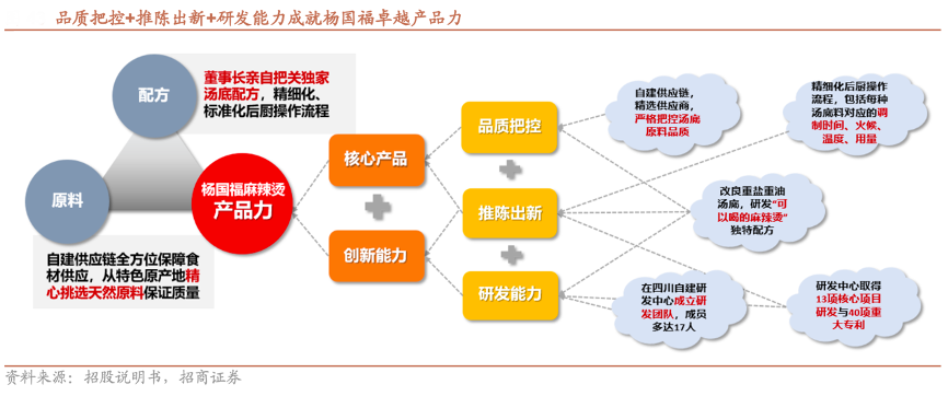 經典案例:根據招股說明書、招商證券等綜合資訊表明,為打破消費者對于麻辣燙的刻板印象,楊國福公司以健康為價值觀核心,創新性地在麻辣燙湯底中加入全脂奶粉以及牛骨粉等營養成分,為人體穩定提供鈣元素、脂肪、維生素、礦物質等人體必需的微量元素,研發出“可以喝的麻辣燙”的獨特配方。此外,其還堅持順應市場趨勢優化現有配方并進行產品推陳出新,分別于 2019 年 6 月以及 2020 年 5 月推出了“番茄麻辣湯”以及“醇香麻辣燙”兩大湯底,進一步豐富了其產品矩陣。
