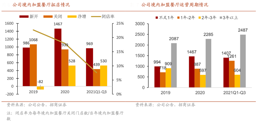 經典案例:根據公司公告、招商證券等綜合資訊表明,疫情期間楊國福公司開店節奏加快,閉店率大幅度下滑,近四成以上加盟餐廳運營周期超過 3 年。2019-2020 年及 2021 年 Q1-Q3 其公司新開門店 986 家/1467 家/969 家,關閉門店 1068 家/939 家/439 家,目前公司已經與部分 加盟商建立穩定長期穩固的合作關系,4 成以上加盟餐廳運營周期超過 3 年。