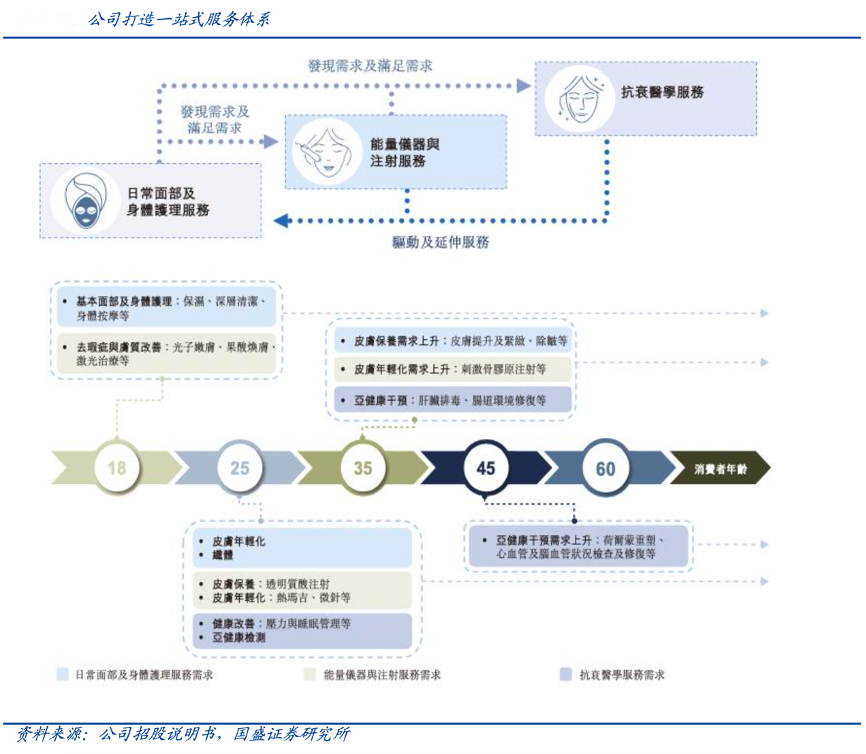 經(jīng)典案例:根據(jù)公司招股說明書、國盛證券研究所等綜合資訊表明,美麗田園公司建立多元服務體系,通過日常面部及身體護理服務初步獲客,進而延伸至能量儀器與注射服務及抗衰醫(yī)學服務等進階服務。截至 2022 年 4 月,共涵蓋 47 類服務項目,超過 800 個 SKU,跨越客戶全生命周期。不同項目之間可形成協(xié)同效應共同提升客單及留存,日常護理業(yè)務活躍會員數(shù)為 7.6 萬,導流至輕醫(yī)美及抗衰部分業(yè)務的活躍會員數(shù)分別 1.7 萬/0.3 萬人,占比約26.3%。