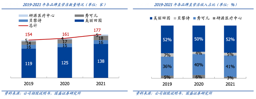 經(jīng)典案例:根據(jù)公司招股說明書、國盛證券研究所等綜合資訊表明,美麗田園公司僅為現(xiàn)有日常面部及身體護理客戶中有更進階需求的城市開設秀可兒和研源醫(yī)療中心。2021年 177 家直營店中,美麗田園/貝黎詩/秀可兒/研源醫(yī)療中 心分別為 138/16/18/5 家,客戶到店總數(shù)占比分別為 85%/9%/5%/1%,收入占比分別 為52%/5%/41%/3%,各品牌之間橫向比較而言,秀可兒對于到店客戶的產(chǎn)出轉化效率較高。