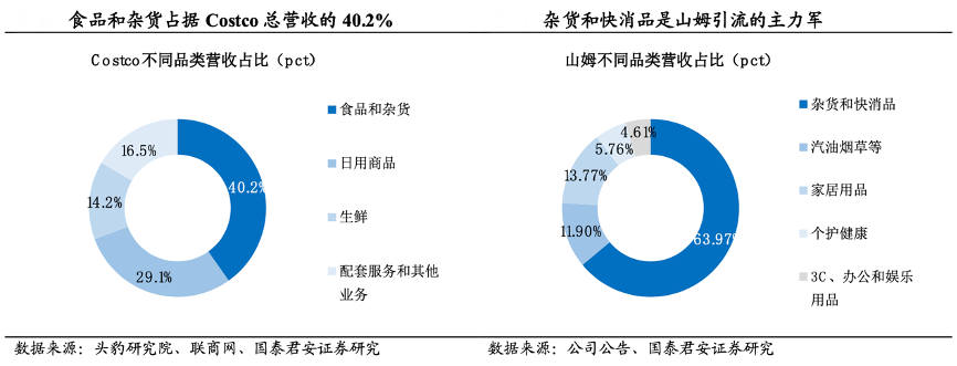 經(jīng)典案例:根據(jù)頭豹研究院、聯(lián)商網(wǎng)、公司公告、國泰君安證券研究等綜合資訊表明,雜貨和快消品是山姆引流的主力軍,食品和雜貨占據(jù)Costco總營收的40.2%,強引流產(chǎn)品帶來大量客流。