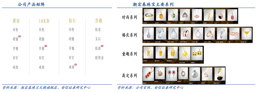 經(jīng)典案例:根據(jù)潮宏基珠寶天貓旗艦店、公司官網(wǎng)、安信證券研究中心等綜合資訊表明,潮宏基消費群體偏年輕,且悅己需求占比較大,其品牌已經(jīng)形成了時尚、婚慶、童趣和高定四大系列來滿足不同客群的需求。每個系列下包含吊墜、項鏈、手鏈、戒指、耳飾、手鐲、串珠這七大品類;材質(zhì)上除了主推的 K 金外,涵蓋黃金、鉆石、鉑金、珍珠以及彩寶等。以各大珠寶品牌的天貓旗艦店為例,2022 年 3 月潮宏基珠寶 SKU 達 2667 個,僅次于周大福位居行業(yè)第二。