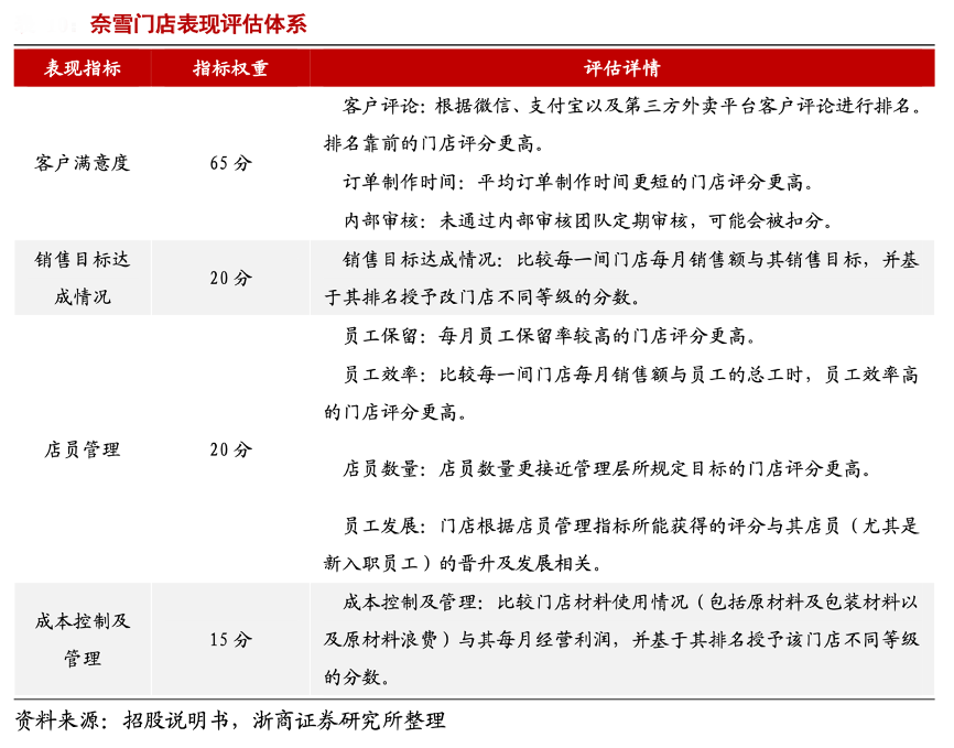 經典案例:根據招股書、浙商證券研究所等綜合資訊表明,為了充分調動的員工積極性,奈雪的茶于 2019 年 9 月在深圳首次推出 A 計劃體系,并于 2020 年 6 月全國開展。A 計劃體系意味著奈雪的茶每月對線下門店進行評估,并根據其表現,將門店分為三個等級,其中最高等級指排名前 30%,最低等級指排名后 20%,各等級的門店員工可獲得的獎金各不相同。