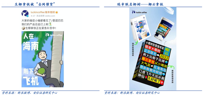 經典案例:根據新浪微博、安信證券研究中心等綜合資訊表明,瑞幸于 2021 年 4 月推出爆款產品生椰拿鐵,同年 9 月,瑞幸又上線新品絲絨拿鐵,9 天賣出 270 萬杯。2022 年 4 月,瑞幸和椰樹聯名的新品椰云 拿鐵上線,產品設計保留了椰樹一貫的“設計界泥石流”PPT 風格,網友紛紛用椰云拿鐵模仿椰樹經典廣告 pose,瑞幸又一次引爆網絡。