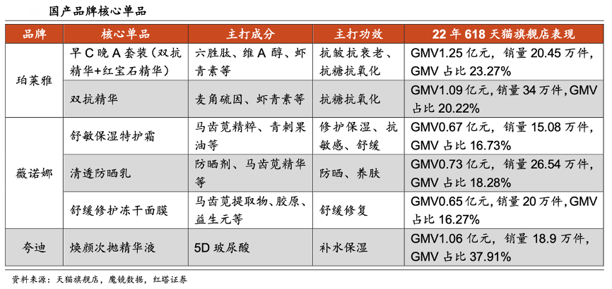 經典案例:根據天貓旗艦店、魔鏡數據、紅塔證券等綜合資訊表明,薇諾娜的大單品舒敏保濕特護霜以馬齒莧、青刺果等云南特色植物提取物為有效成分,適宜專業敏感肌護理。而夸迪憑借“全球第 一大玻尿酸供應商”IP,打造核心單品煥顏次拋精華液,2022 年 618 期間該 產品在天貓旗艦店實現 GMV1.06 億元,銷量 18.9 萬件,GMV 占比 37.91%。