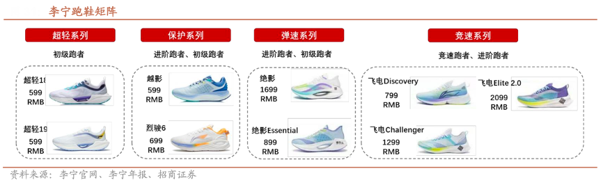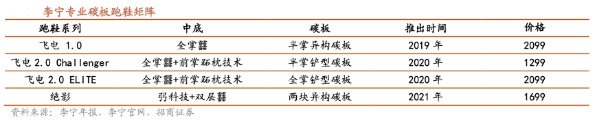 經(jīng)典案例:根據(jù)李寧官網(wǎng)、李寧年報(bào)、招商證券等綜合資訊表明,李寧通過?科技實(shí)現(xiàn)頂尖技術(shù)突破,2019 年李寧推出第一款碳板跑鞋飛電 1.0,?科技搭載半掌異構(gòu)的碳板,售價(jià) 2099 元,正式進(jìn)入頂級跑鞋行列;并于2020 年推出搭載全掌碳板的飛電 2.0 ELITE;東京奧運(yùn)會 上公司的精英級競速跑鞋飛電 2.0 出現(xiàn)在馬拉松比賽的項(xiàng)目中,并且是整個東京奧運(yùn)會馬拉松完賽選手上腳的跑鞋中 唯一的中國品牌跑鞋,標(biāo)志李寧產(chǎn)品性能達(dá)到世界頂尖水平,成功躋身競速跑鞋的第一梯隊(duì)。