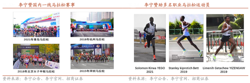 經(jīng)典案例:根據(jù)李寧公告、李寧官網(wǎng)、李寧年報、招商證券等綜合資訊表明,李寧公司自 2006 年贊助北京馬拉松,建立 irun 跑團(tuán),并于 2012 年創(chuàng)辦李寧 10k 賽事,不斷擴(kuò)大品牌在跑步領(lǐng)域的影響力。2018 年李寧首次贊助杭州馬拉松,標(biāo)志著李寧重回國內(nèi)一線馬拉松贊助商行列,隨后贊助青島馬拉松、無錫馬拉松;持續(xù)贊助馬拉松運動員并助力其取得多項賽事獎牌,李寧利用自身品牌影 響力強(qiáng)的優(yōu)勢,結(jié)合賽事贊助保持產(chǎn)品曝光度和熱度。