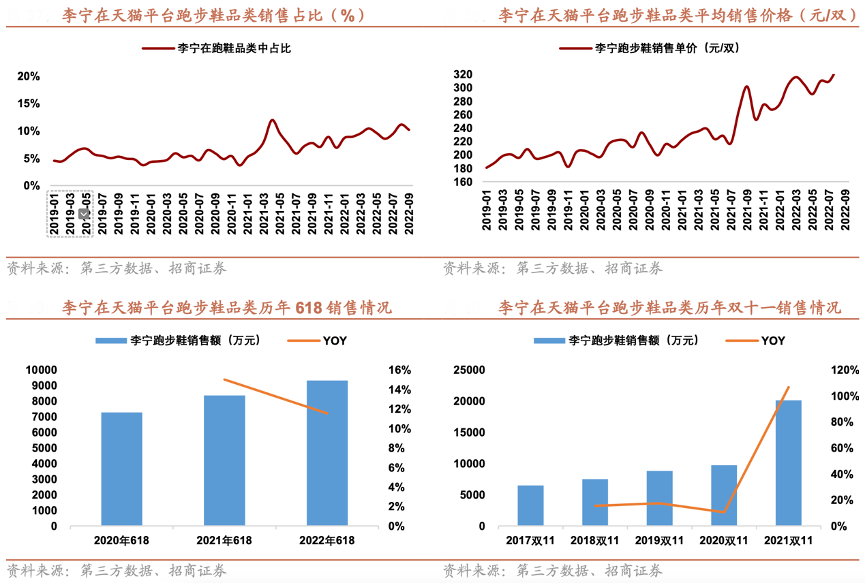 經(jīng)典案例:根據(jù)第三方數(shù)據(jù)、招商證券等綜合資訊表明,從線上渠道看,李寧在天貓平臺跑步鞋品類的銷售占比從 2019 年的 5%提升至 2022 年的 10%,銷售平均價格從 200 元左右提升至 280 元左右。從 618 和雙十一兩個大促節(jié)點上看,2020-2022 年 618 期間,李寧跑步鞋銷售額從 7267 萬元提升至 9321 萬元,明顯看出李寧通過科技升級,中高端跑鞋認(rèn)可度提升,價格帶上移,同時帶動市場份額提升。
