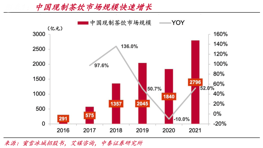 經典案例:根據蜜雪冰城招股書、艾媒咨詢、中泰證券研究所等綜合資訊表明,現制茶飲市場規模近3000億,其以水果為基礎原料,現場及時制作,口味出眾等特點,推動了市場規模迅速擴大。根據艾媒咨詢,2021年中國現制茶飲市場規模達到2796億元,2016年-2020年市場規模CAGR為57.2%。