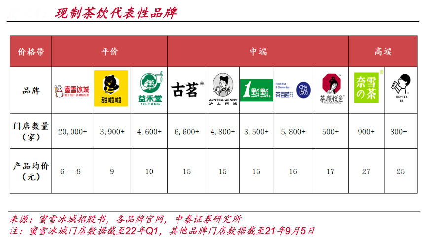 經典案例:根據蜜雪冰城招股書、各品牌官網、中泰證券研究所等綜合資訊表明,按照產品價格帶劃分,25元以上的高端茶飲賽道奈雪與喜茶雙 雄爭鋒;10-25元的中端市場玩家眾多,競爭激烈;而0-10元的平價市場上,蜜雪冰城無論是銷售額還是門店數量遙遙領先,牢牢占據龍頭地位。