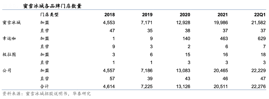 經(jīng)典案例:根據(jù)蜜雪冰城招股說明書、華泰研究等綜合資訊表明,蜜雪冰城公司以直營為引導,加盟為主體進行擴張。直營門店由公司直接設立,享受門店銷售商品收益、承擔門店開支;加盟門店由公司進行審核批準,公司向加盟商收取固定的加盟費/管理費/培訓費等及向加盟商提供食材/設備/運營指導等。蜜雪冰城主要以加盟模式進行擴張,截至 22Q1,全國共有 22,276 家門店,其中 22,229 家為加盟門店。