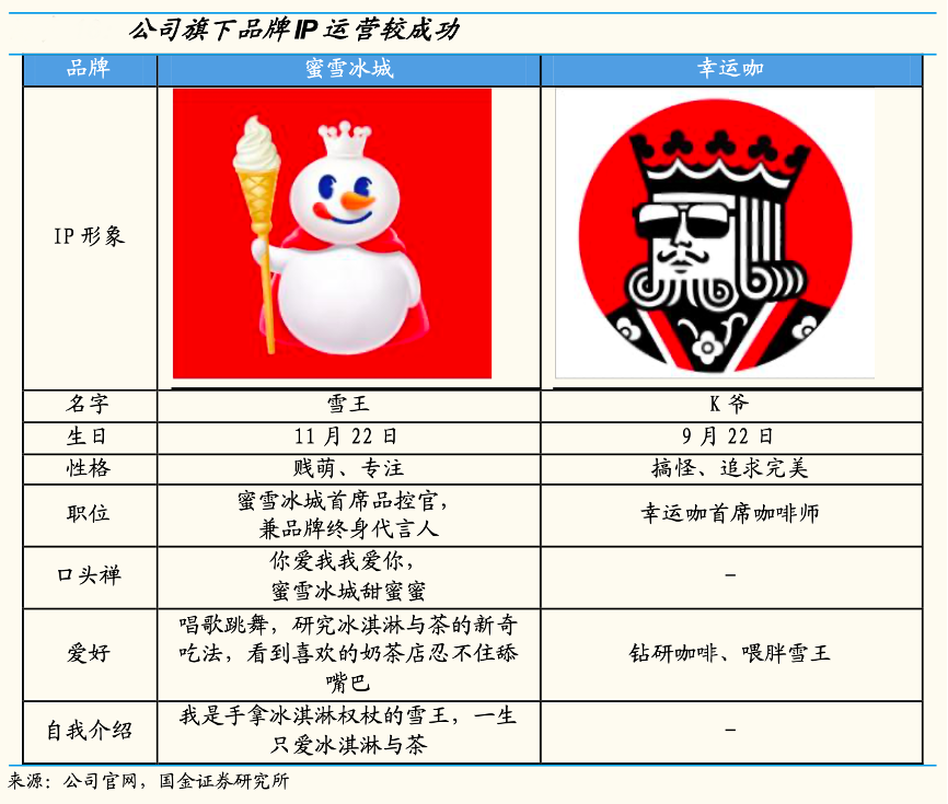 經(jīng)典案例:根據(jù)公司官網(wǎng)、國金證券研究所等綜合資訊表明,蜜雪冰城人格化 IP“雪王”營銷成功,2021年洗腦廣告曲傳播進一步推升品牌知名度。從經(jīng)驗上看,人格化 IP 的成功塑造有助于形成品牌與消費者間的情感鏈接、提升品牌黏性。