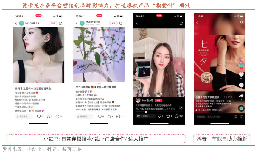 經典案例:根據小紅書、抖音、招商證券等綜合資訊表明,曼卡龍在小紅書、抖音等媒介通過日常穿搭推薦、與線下商場門店以及達人合作等方式深化品牌定位,精準客戶畫像。節假日內如七夕等節日,品牌借助節日氣氛,推進爆品“指愛針”的銷售,為品牌在渠道上的發展做好鋪墊。“指愛針”的營銷內容在抖音達到 7.9 億播放量,互動 3000+萬,520、七夕期間,爆款項鏈在天貓、京東的單品銷量榜均為第一。